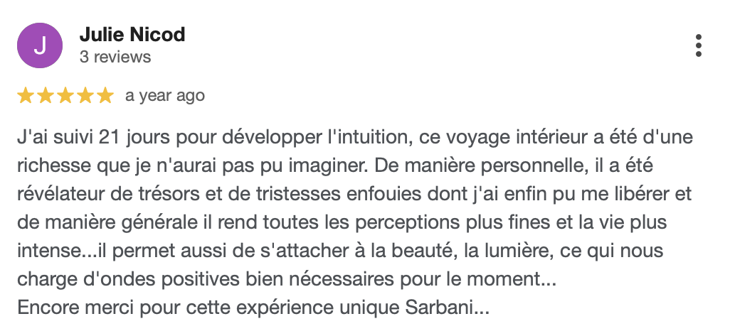 « ce voyage intérieur a été d'une richesse que je n’aurais pas pu imaginer. il m’a permis de me libérer et de ressentir la vie plus intensément. » — julie